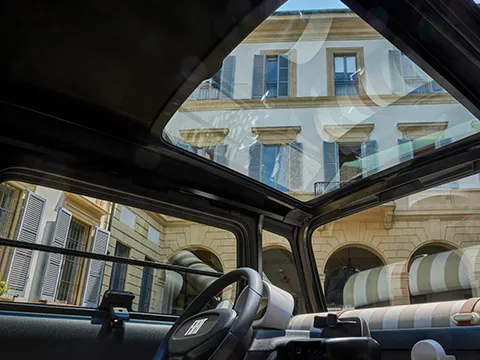 Il réduit l'éblouissement de la lumière directe du soleil, vous protège du soleil et du vent et donne à votre Topolino une touche spéciale. Disponible uniquement sur version Dolcevita